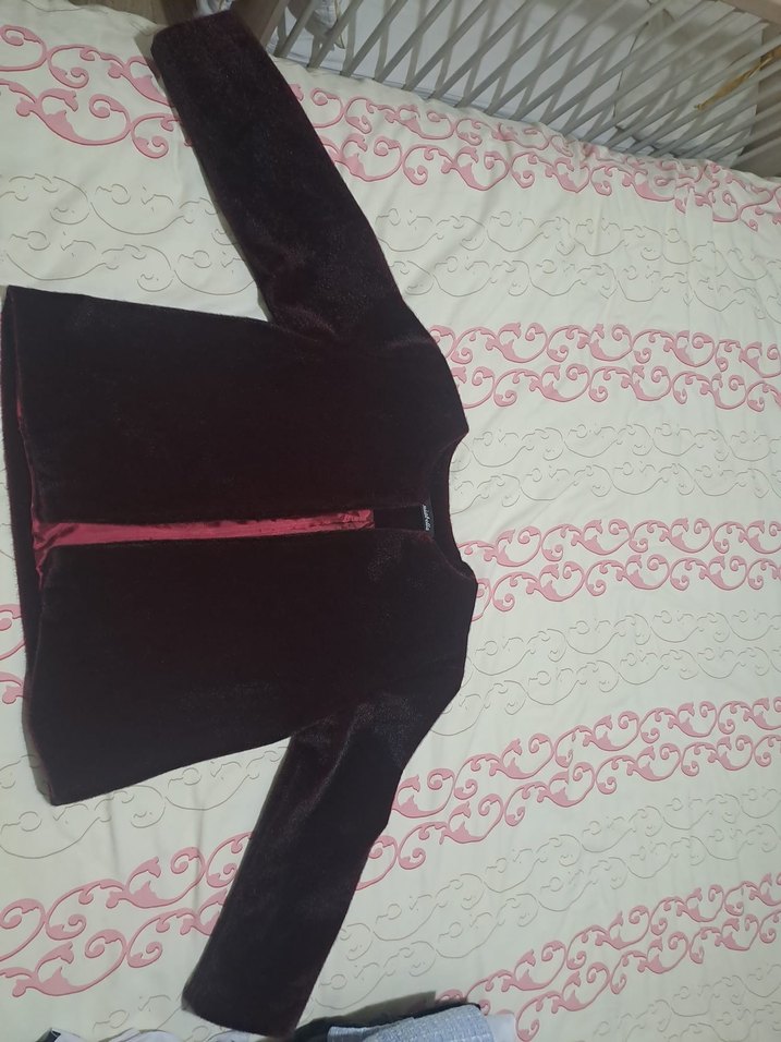 Bordo renkli, V yakalı ve fermuarlı, uzun kollu, normal boy midi kesim kadın ceketi. dışı peluş içi satendir. etek deri ve pileli. birer kez giyildi.