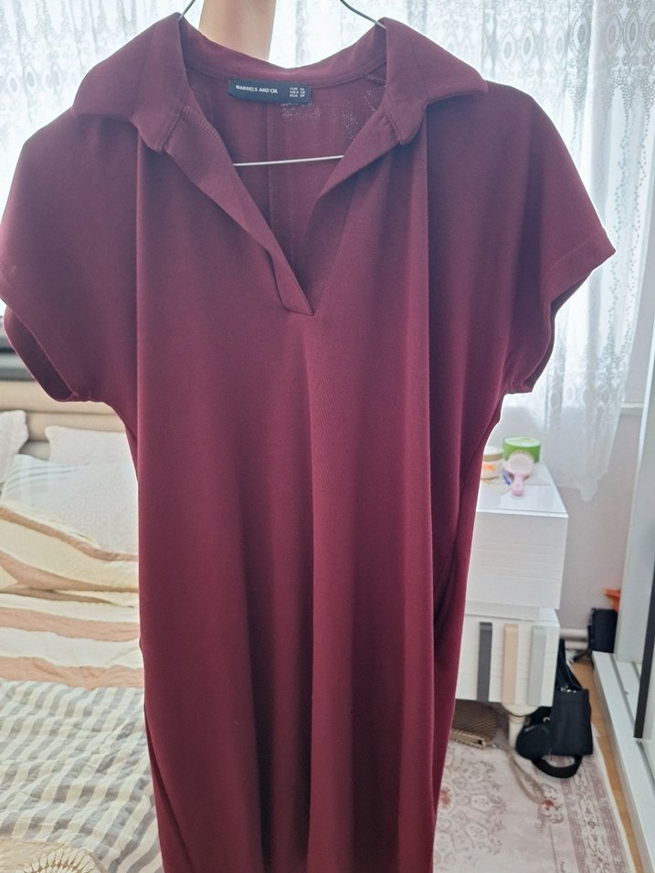 Bordo renkli hamile tunik, V yakalı ve kısa kollu. Bol kesim ve drapeli tasarımıyla midi boyda, yumuşak sentetik kumaştan üretilmiştir. Günlük kullanıma uygundur.