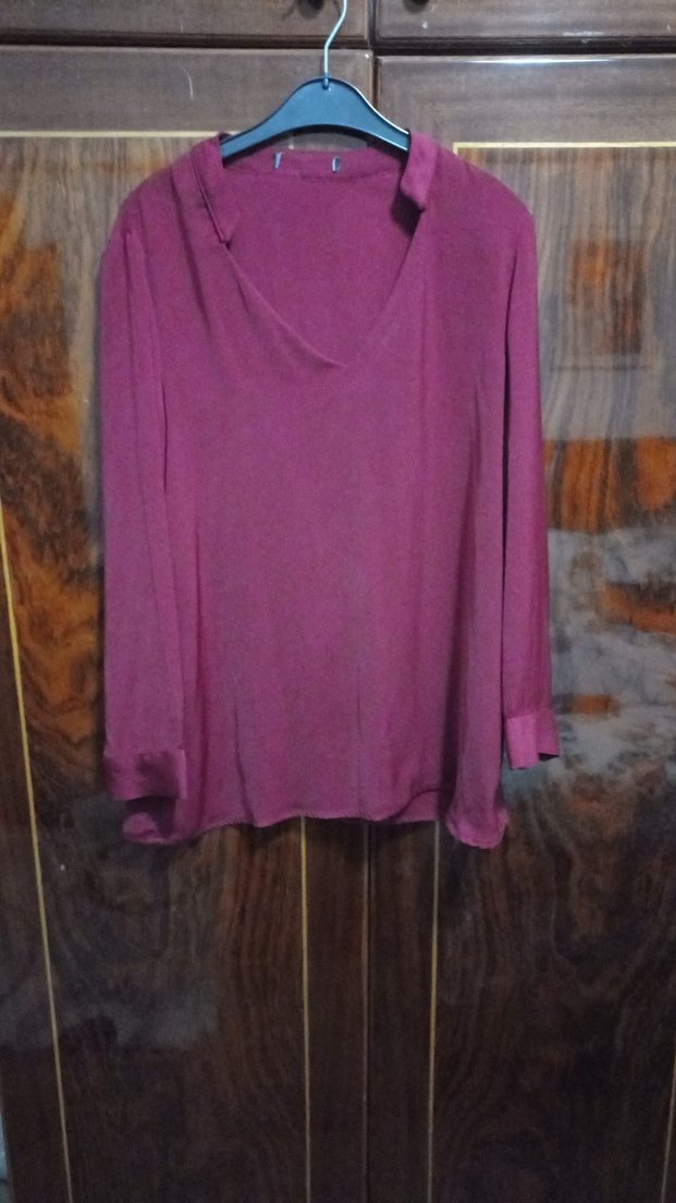 Bordo renkte, V yakalı ve uzun kollu kadın bluz, ipeksi dokusu ve rahat kesimiyle günlük kullanıma uygun, minimalist ve şık bir tasarıma sahiptir.