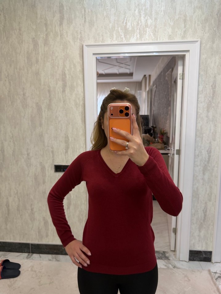 Bordo renginde, V yakalı ve uzun kollu, yumuşak ve sıcak kumaştan yapılmış, vücuda oturan kadın triko. Günlük kullanıma uygun, rahat ve sade stil sunar.