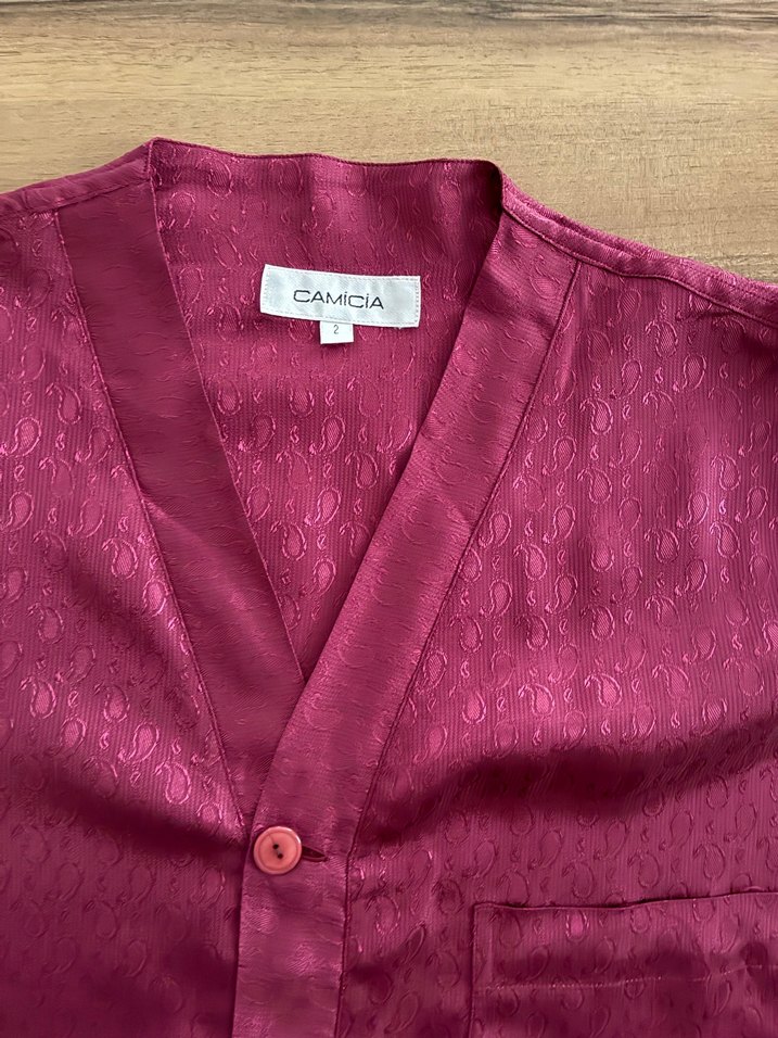 Bordo renkli, V yakalı ve kısa kollu hemşirelik sabahlığıdır. Parlak ve desensiz dokusu, bol kesimi ve midi boyu ile rahatlık sağlar. Marka CAMICIA.