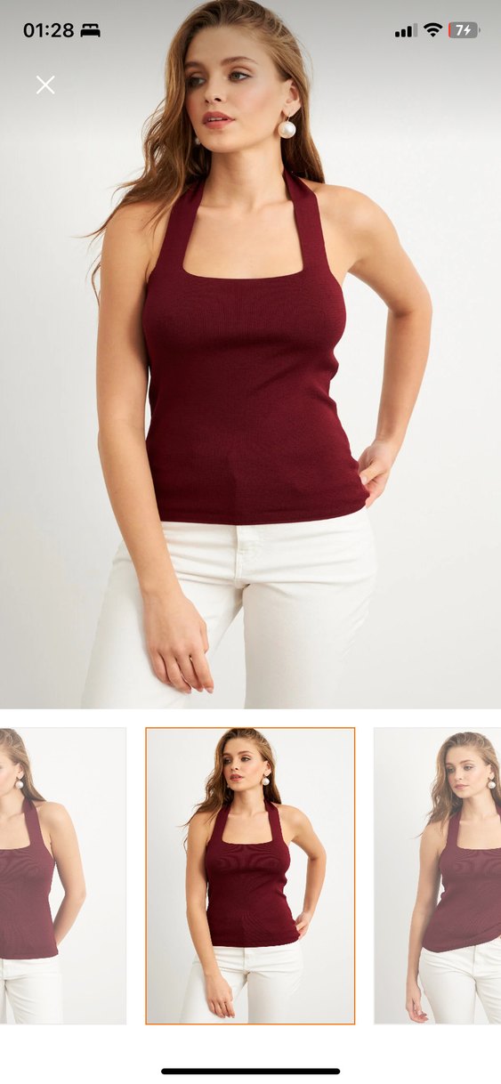 Pamuk kumaştan, bordo renkli, V yakalı ve kolsuz bu dar kesim kadın bluz, günlük kullanıma uygun rahat ve şık bir seçenektir.