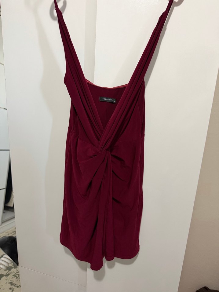 Bordo renkli, keten kumaştan, V yakalı ve drapeli tasarıma sahip, midi boy ve fitted kesim kadın atlet. Minimalist ve çağdaş tarzda, romantik akşamlar için uygun.