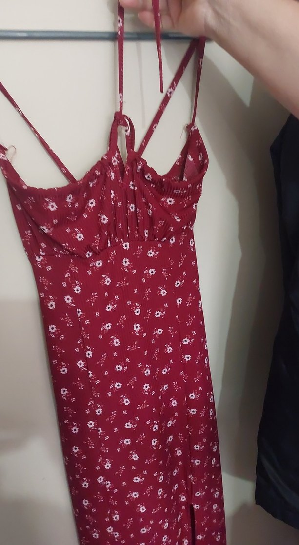 Bordo renkte, askılı, V yaka ve drapeli detaylara sahip midi boy bohem elbise. Baskılı deseni ve fitted kesimiyle romantik akşamlar için uygun.