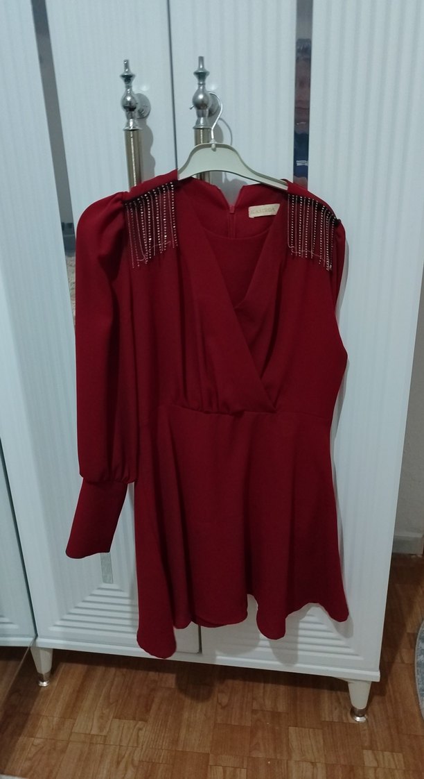 Bordo midi tunik pantolon da var kırmızı , V yakalı ve uzun kolludur. Salaş kesimi, drapeli detayları ve nakışlı desenleri ile klasik ve şık bir görünüm sunar.