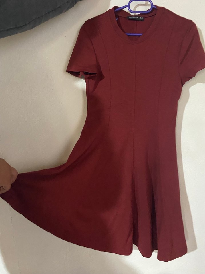 Bordo midi elbise, kısa kollu ve V yakalıdır. Sentetik kumaştan, drapeli ve rahat kesimlidir, günlük sokak giyimine uygundur. M beden bir kere giyildi