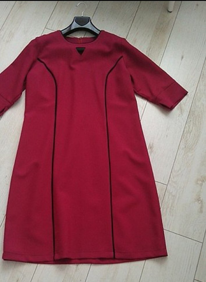 Bordo renkte, V yakalı ve yarım kollu elbise. Normal kesim ve drapeli tasarıma sahip, midi boyda ve günlük kullanıma uygun.