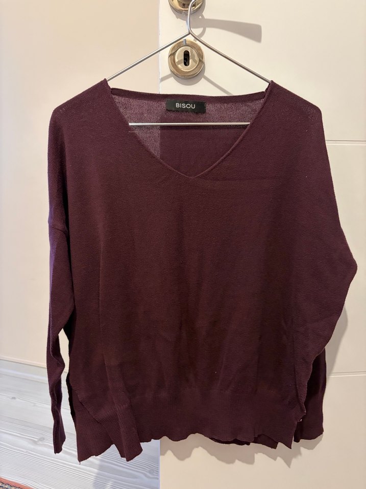 Bordo renkli, V yakalı, bol kesim ve uzun kollu yün örgü kadın kazak, günlük kullanıma uygun rahat ve sıcak bir yapıya sahiptir.
