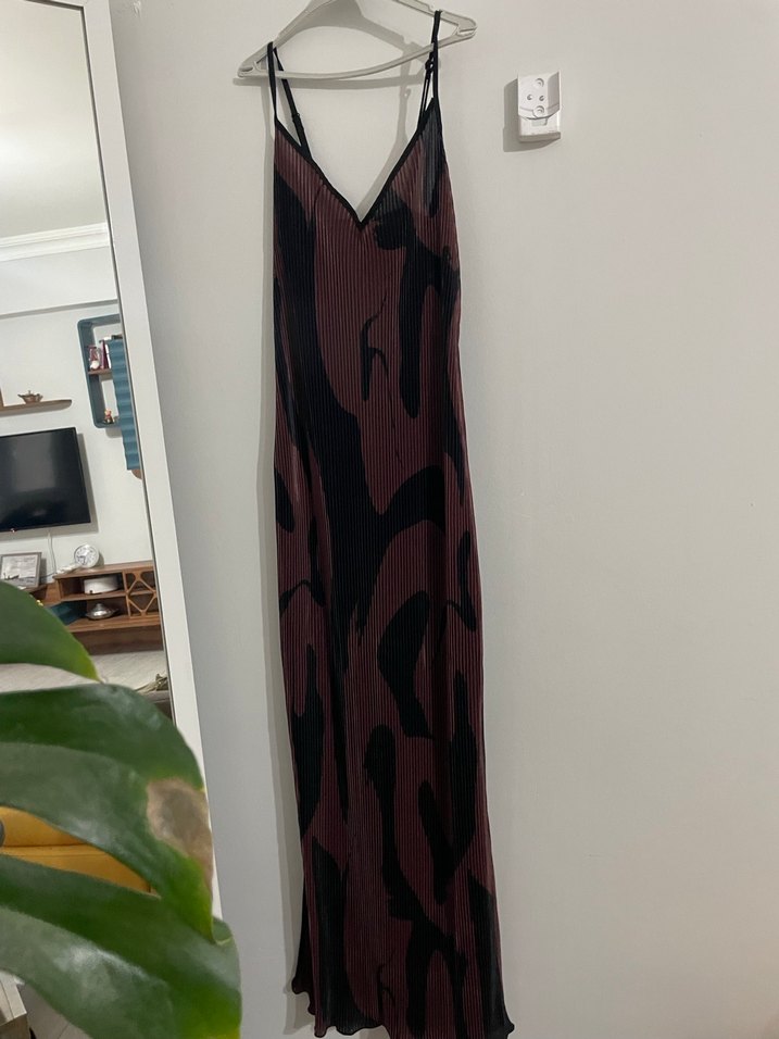 Bordo V Yakalı Pilili Uzun Elbise