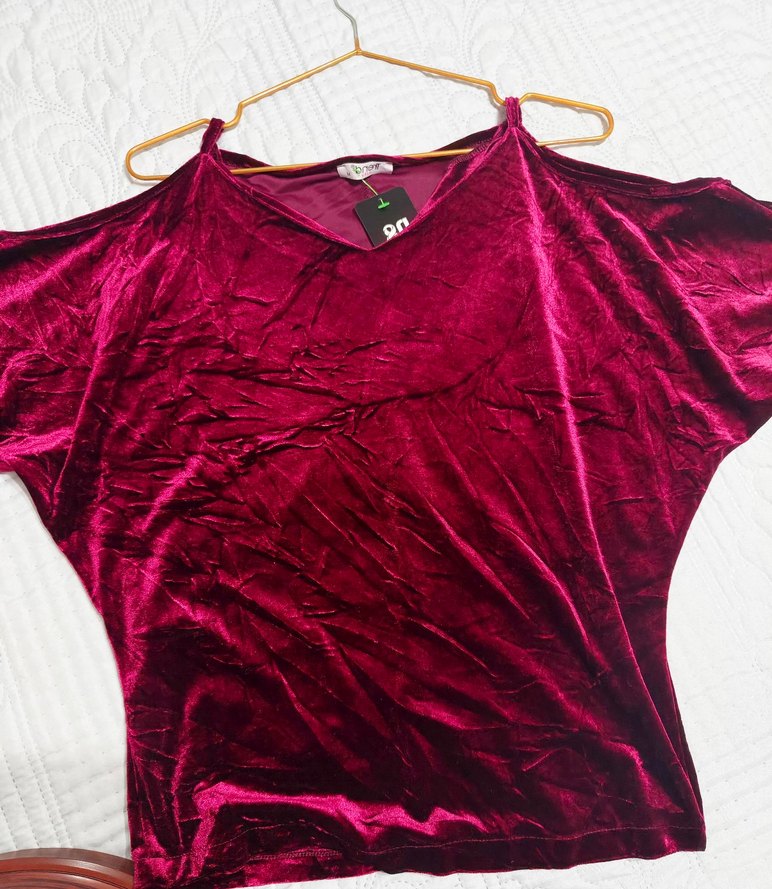 Bordo renkte, V yakalı ve kısa kollu, saten kumaştan yapılmış, salaş ve drapeli bluz. Parlak m beden l uyumlu