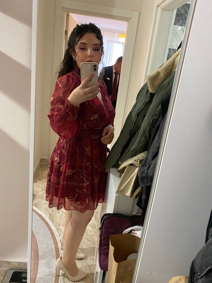 Bordo renkli, V yakalı, uzun kollu midi elbise. Şifon transparan ve parlak dokusuyla romantik akşamlar için uygun.