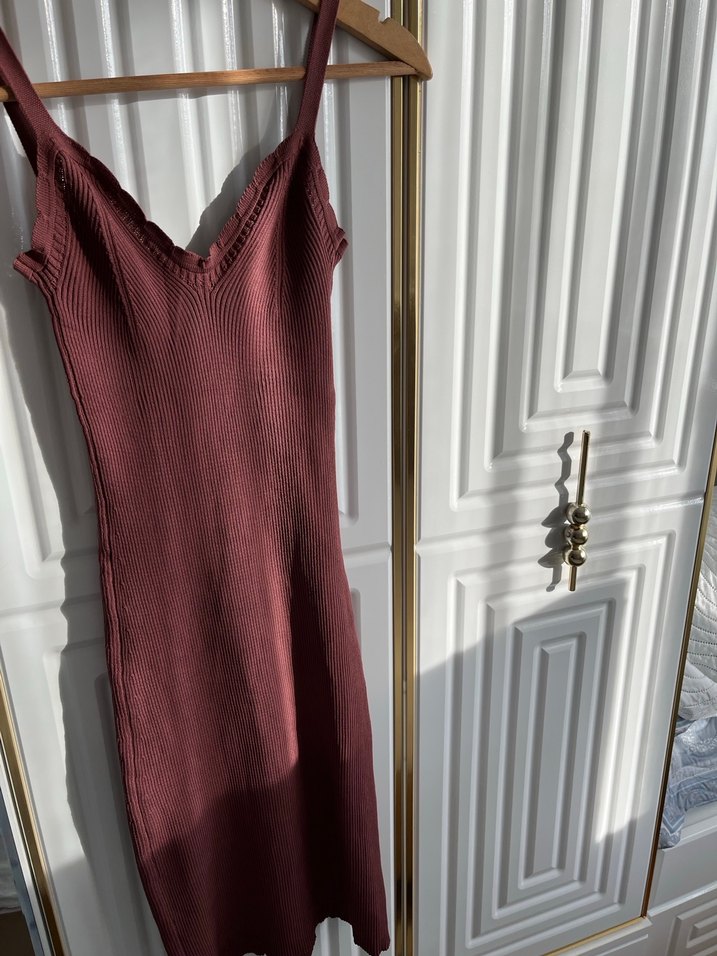 Bordo renkte, v yakalı, drapeli ve triko kumaştan yapılmış, midi boy, kolsuz ve vücuda oturan elbise. Minimalist ve bohem tarzda, günlük kullanım için uygundur.