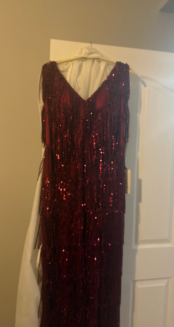 Bordo renkte, V yakalı ve kolsuz uzun abiye elbise. Drapeli tasarımı ve payet detaylarıyla şık bir görünüm sunar. ✨