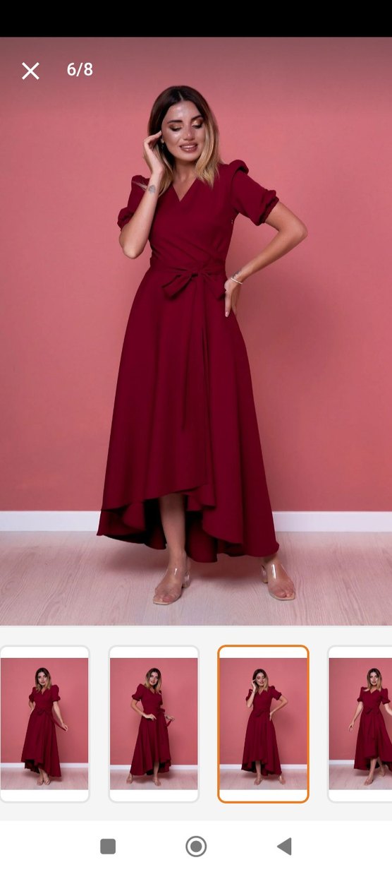 Bordo uzun elbise, V yakalı ve askılı kol detaylı, drapeli tasarıma sahip. İpeksi kumaştan, modern ve gösterişli bir görünüme uygun. Romantik akşamlar için ideal. 1-2 defa giyildi. Durumu çok iyi