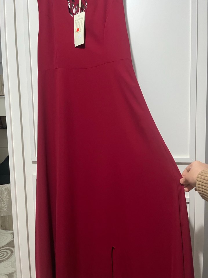 Bordo renkli, V yakalı ve kolsuz uzun elbise. İpeksi kumaştan, drapeli detaylı ve rahat kesimlidir. Modern klasik tarzda, romantik akşamlar için uygundur.