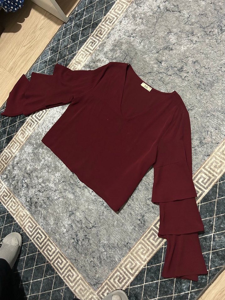 Bordo renkte, V yakalı ve katlı fırfırlı uzun kollu, bol kesim midi uzunluğunda kadın bluz. Yumuşak sentetik kumaştan üretilmiştir, rahat sokak stili için uygundur.