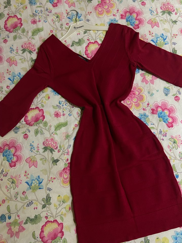 Bordo V Yakalı Uzun Kollu mini Kadın Elbise