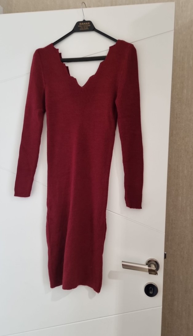 Bordo renk, V yakalı ve uzun kollu bu triko elbise, yumuşak örgü kumaştan yapılmıştır. Uzun boyu ve rahat dokusuyla romantik akşamlar için uygundur. ❤️