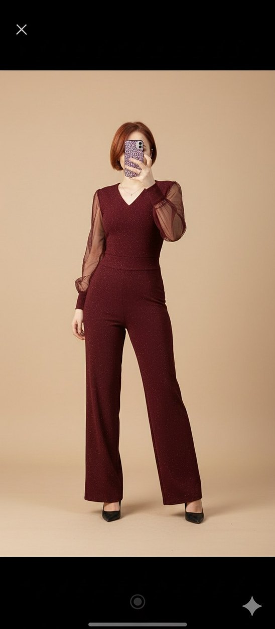 Bordo renkli, V yakalı ve şeffaf uzun kollu bu tulum, çağdaş ve zahmetsiz şıklık sunar. Ofis için uygun, normal boy ve regular fit. XS S uyumlu daralma yapıldı