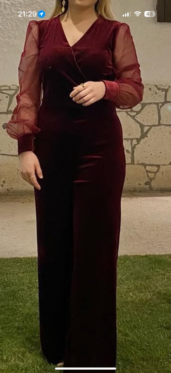 Bordo midi tulum, V yaka ve uzun drapeli kollara sahiptir. Sentetik kumaştan üretilmiş, klasik zarafette gotik tarz sunar. Düğünler için uygundur.