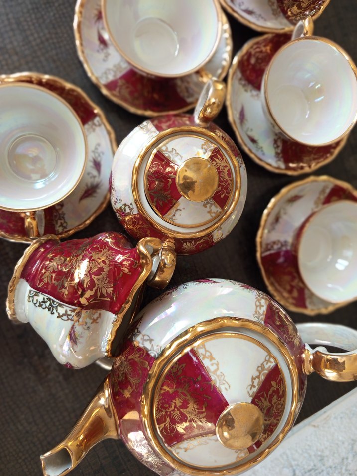 Bordo ve Altın Detaylı Antika Porselen Çay Seti