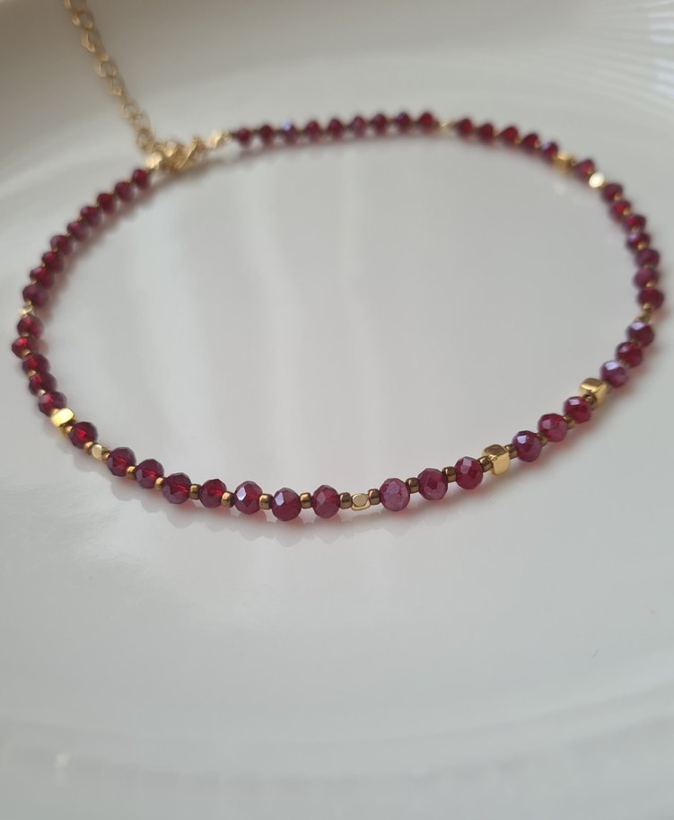 Bordo boncuklar ve küçük altın kaplama boncuk detaylarla tasarlanmış midi uzunlukta, minimalist bohem tarzda kadın kolye. Romantik akşamlar için uygun.