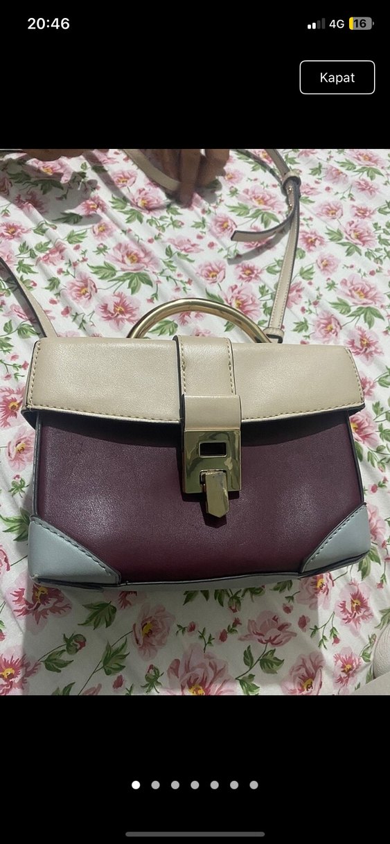 Bordo ve bej renklerin buluştuğu, tokalı deri kadın çantası. Modern klasik tarzı ve pastel detaylarıyla günlük kullanıma uygun, Paris esintili şıklık sunar. mango deri çanta az kullanıldı
