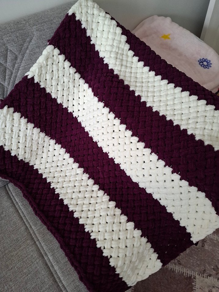 Bordo ve beyaz renklerde, yumuşak dokulu örgü çocuk battaniyesi, konforlu ve sıcak tutar.