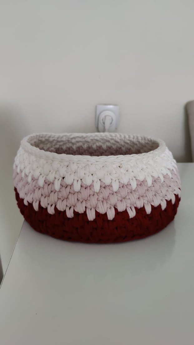 Açık bordo ve beyaz tonlarında örgü desenli, küçük eşyalar için uygun sepet.