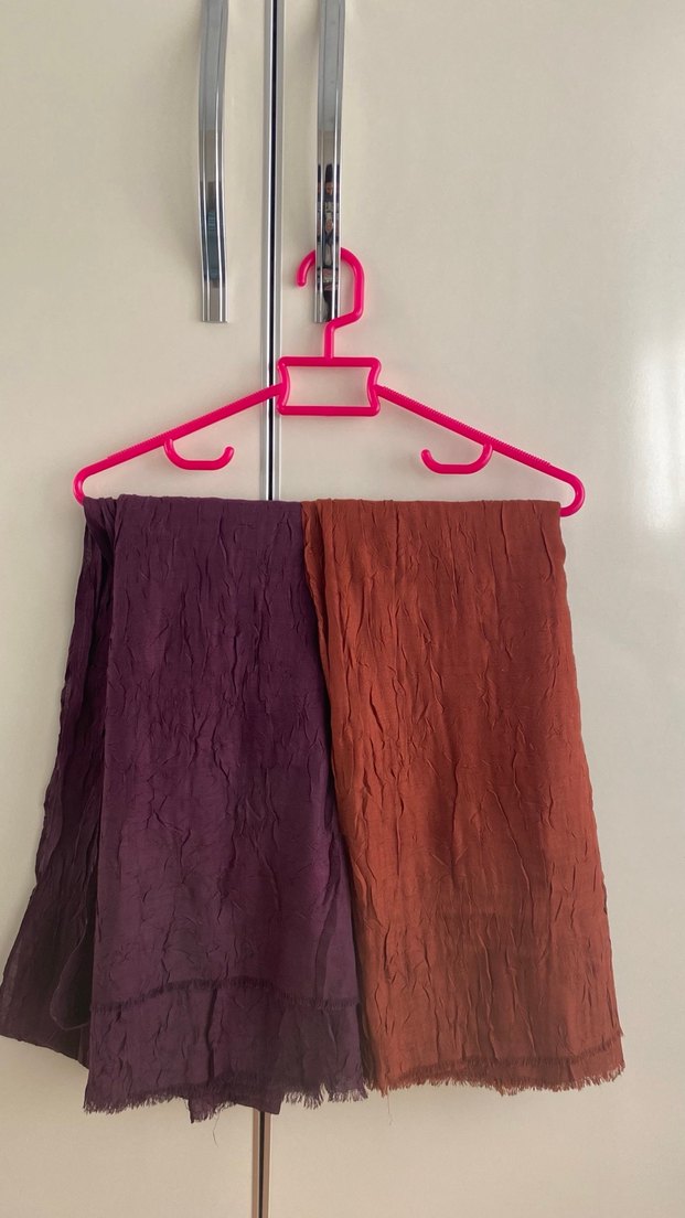 Bordo ve kiremit renklerinde, keten kumaştan yapılmış, bohem tarzda, dökümlü kadın şalı.