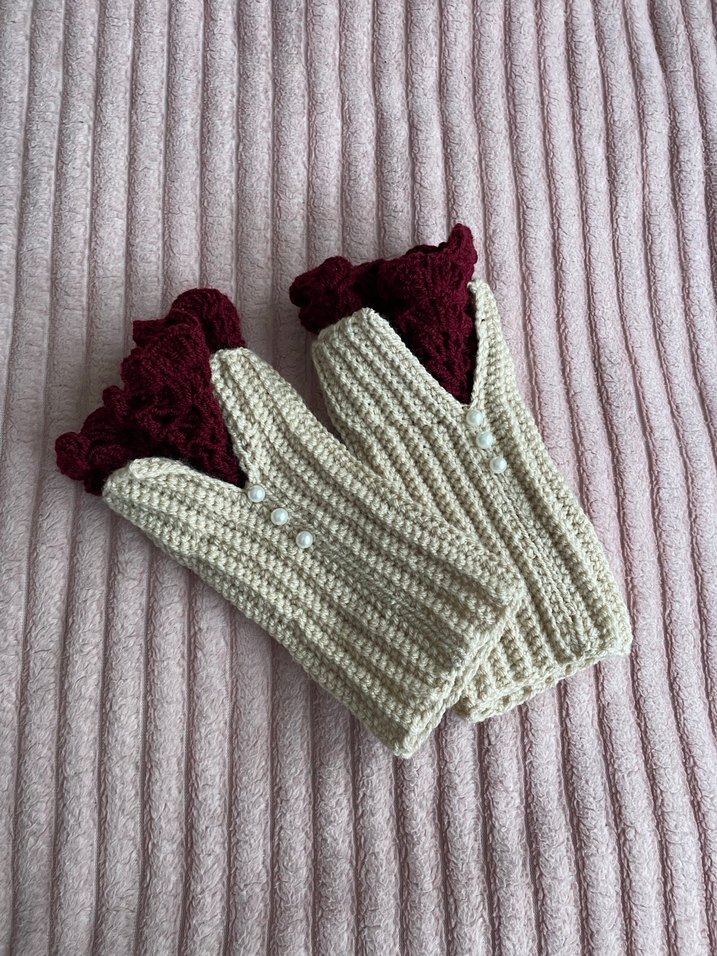 Bordo ve krem renklerde, inci detaylı örgü kadın eldivenleri, bohem ve rahat tarzları bir araya getiriyor. İsteğe göre renk ve inci ayarlanır.