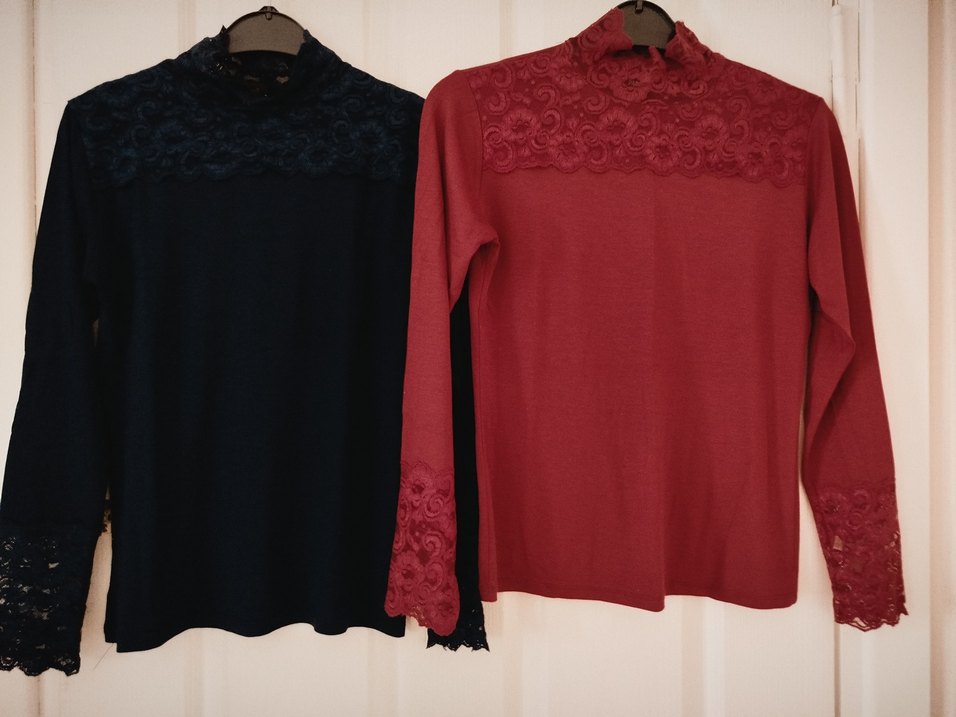 Bordo ve lacivert renklerde, uzun kollu, dantel işlemeli ve yuvarlak yakalı, normal boyda, vücuda oturan kadın bluzları. Günlük kullanıma uygundur.