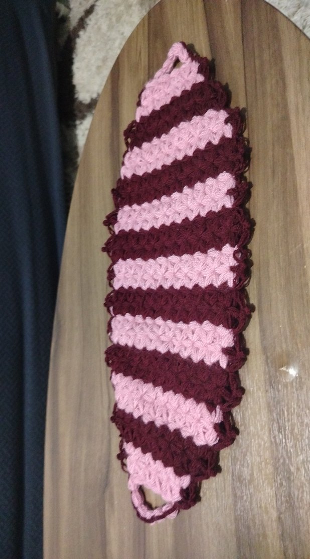 Bordo ve pembe renklerde çizgili, yumuşak dokulu banyo süngeri.