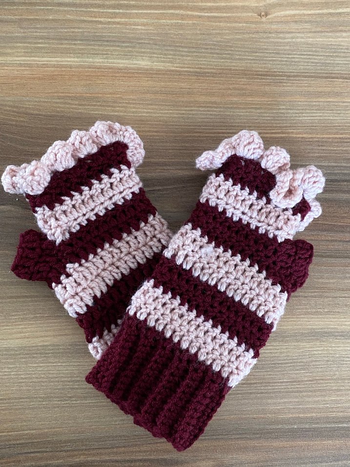 Bordo ve pembe çizgili, örgü bohem tarzda kadın eldivenleri, rahat ve retro bir görünüm sunar. İstenilen renk sipariş alınır