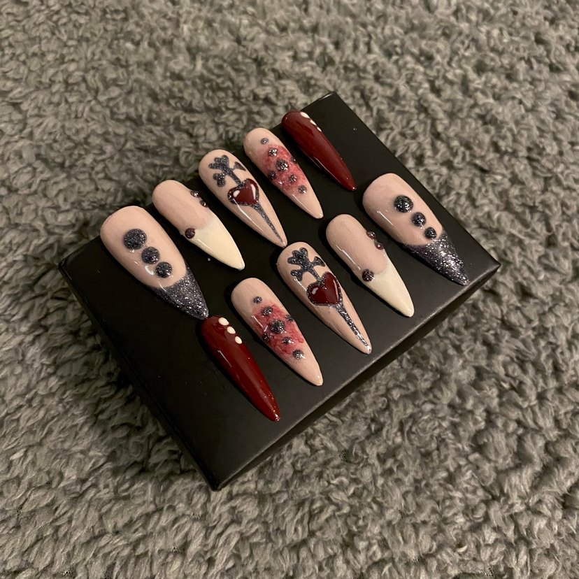 Bordo ve siyah desenli, kalp ve nokta süslemeleri içeren takma tırnak seti. Gorsel bana aittir 10 adet takma tirnak setidir.
