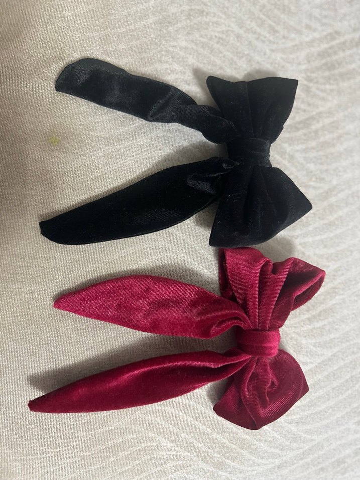 Bordo ve siyah renklerde, yumuşak sentetik kumaştan yapılmış kadife fiyonk saç tokaları, gotik Paris tarzında.