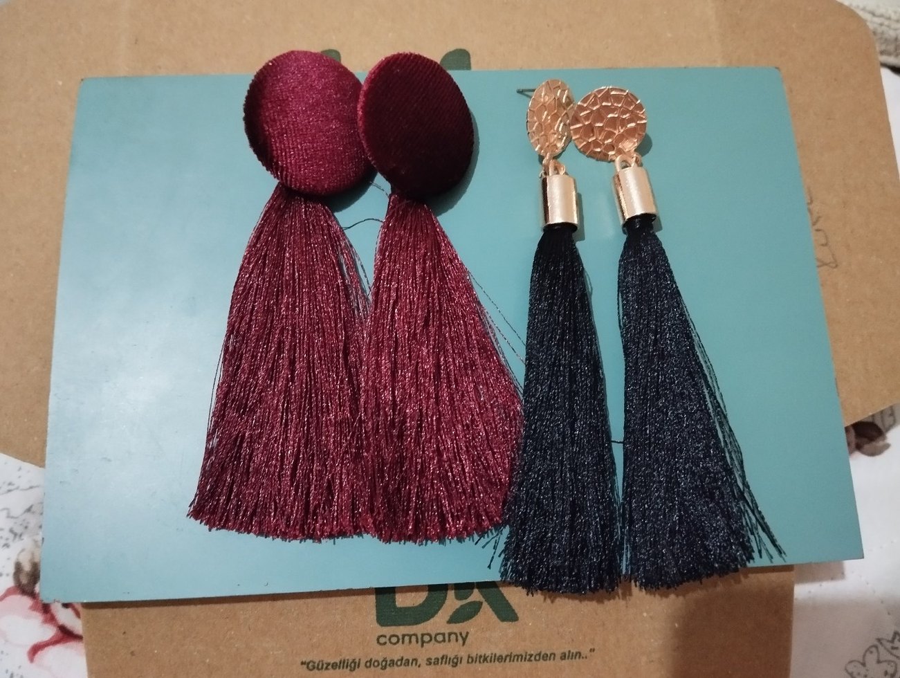 Bordo ve siyah renklerde, nakış detaylı uzun püsküllü küpeler. Romantik akşamlar için bohem tarzda, retro dokunuşlu. çok az kullanıldı 2li olarak satılıyor