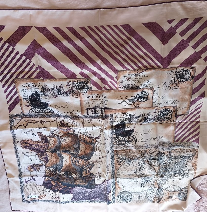 Bordo ve krem tonlarında, gemi ve eski harita baskılarıyla vintage tarzda kadın eşarp Yumuşak tekstil kumaştan, bohem bir görünüm sunar.