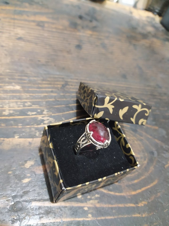 Erkek yüzüğü, koyu bordo taş ve detaylı vintage tarzı tasarıma sahip. Siyah ve altın desenli kutuda sunulur.