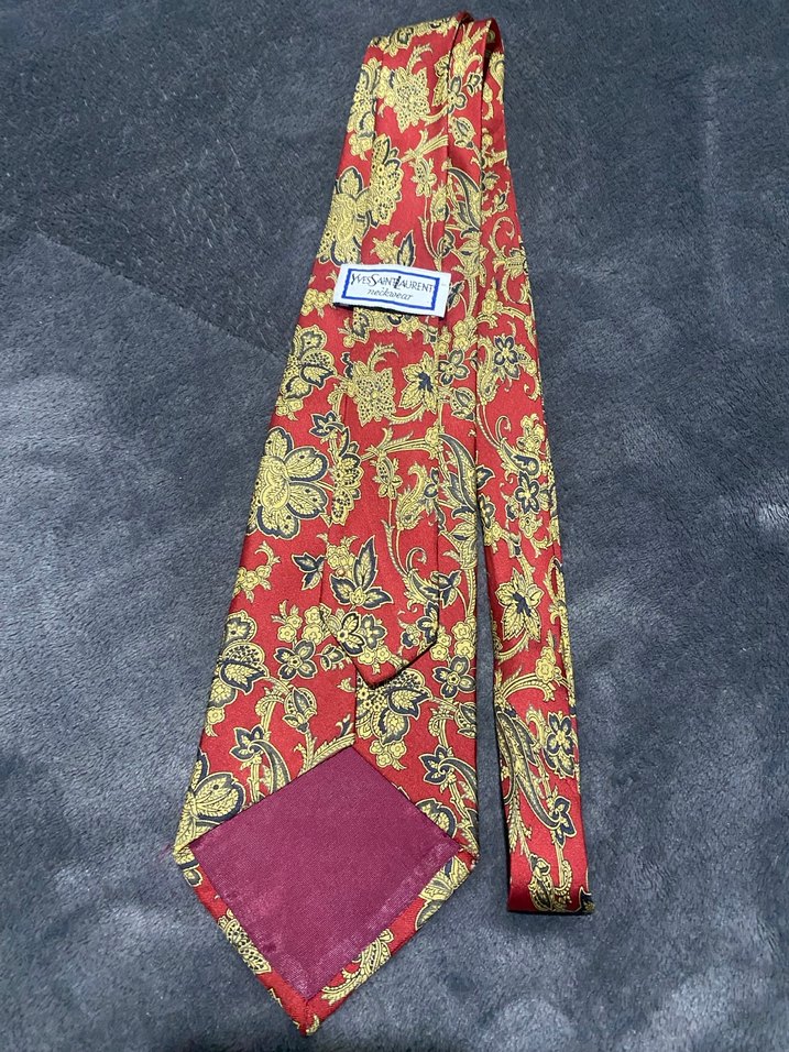 Bordo renkli erkek kravatı, sarı ve siyah vintage çiçek desenleriyle klasik ve geleneksel bir stile sahiptir. Yumuşak kumaş dokusuna sahiptir.