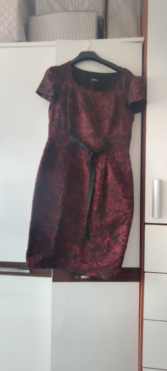 Bordo renkli, desenli ve drapeli, V yakalı, askılı, vintage ve gotik tarzda, ofis için uygun, vücuda oturan midi elbise.