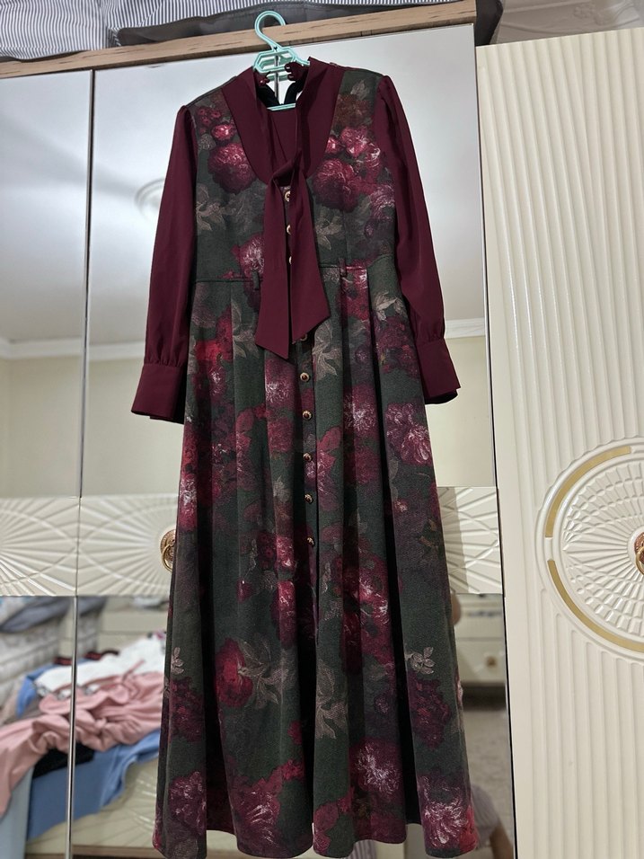 Bordo renkli, uzun kollu, düğmeli ve yakalı vintage desenli uzun elbise. Sentetik kumaştan, bol kesim ve bohem tarzda, ofis kullanımı için uygundur.