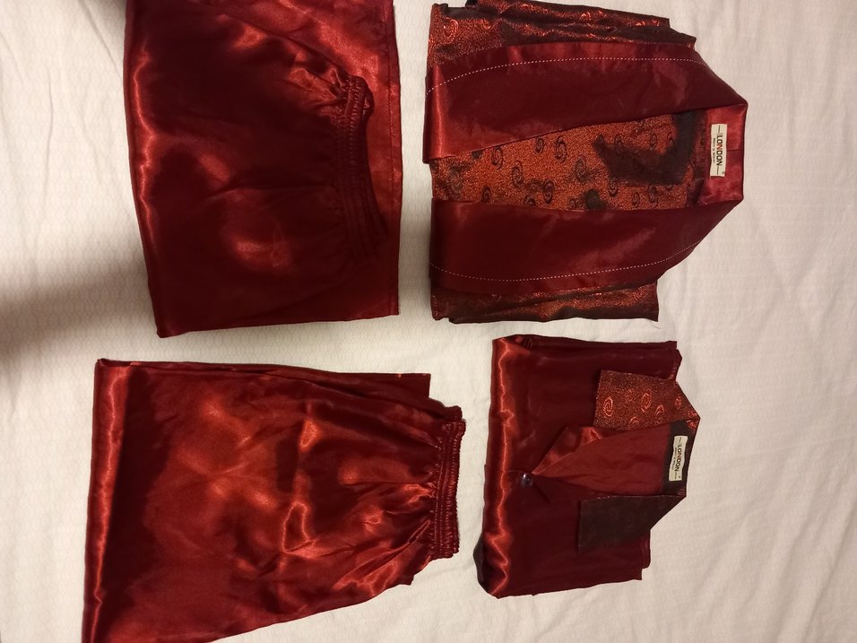 Bordo vintage tarzda erkek pijama takımı, Kumaşı parlak ve yumuşak dokuludur. 4 parçadan oluşan alt üst pijama, şort ve robdöşambr