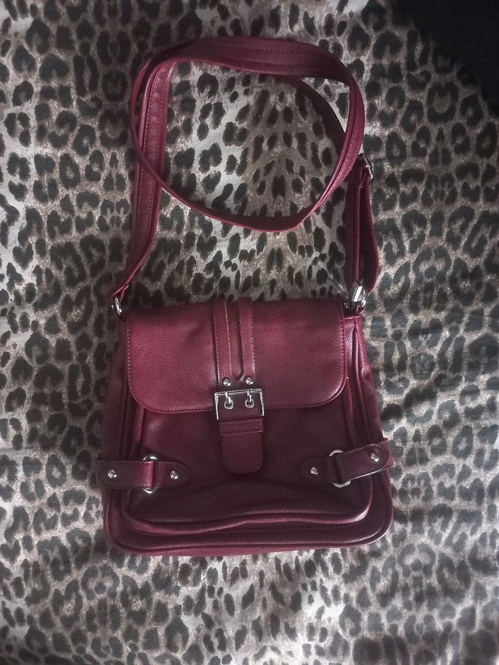 Bordo deri, tokalı kapak ve ayarlanabilir askıya sahip kadın çantası, günlük kullanıma uygun cesur gotik tarzda.