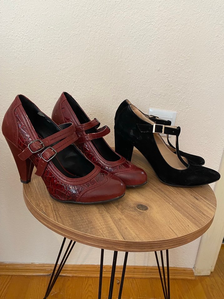 Bordo süet stilettolar, yüksek topuk ve tokalı kayışlarla vintage tarzı ve desenli detayları bir araya getirir. Romantik akşamlar için ideal.