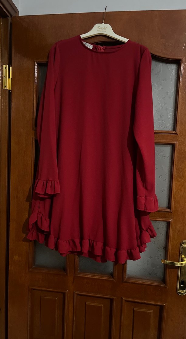Bordo renkli, uzun kollu ve yuvarlak yakalı tunik. Kollarında ve etek ucunda volan detayları vardır. Bol kesim ve midi boyda, sentetik kumaştan bohem tarzda, romantik akşamlar için uygun.