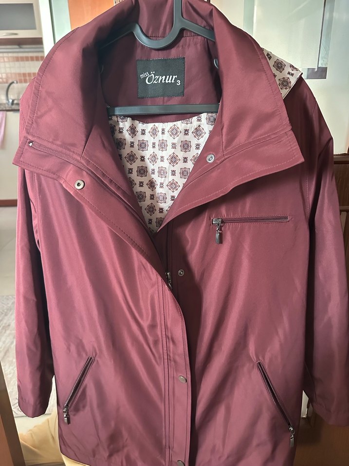Bordo renkli, parlak görünümlü, düğmeli ve fermuarlı cepli, notched lapel yakalı, bol kesim midi kadın ceketi. İç astarında desenli detay bulunur. ✨ çıkabilir kapşonu mevcuttur. Sorunu yoktur hem fermuar hem çıt çıt detaylıdır En 60 boy 72 cm