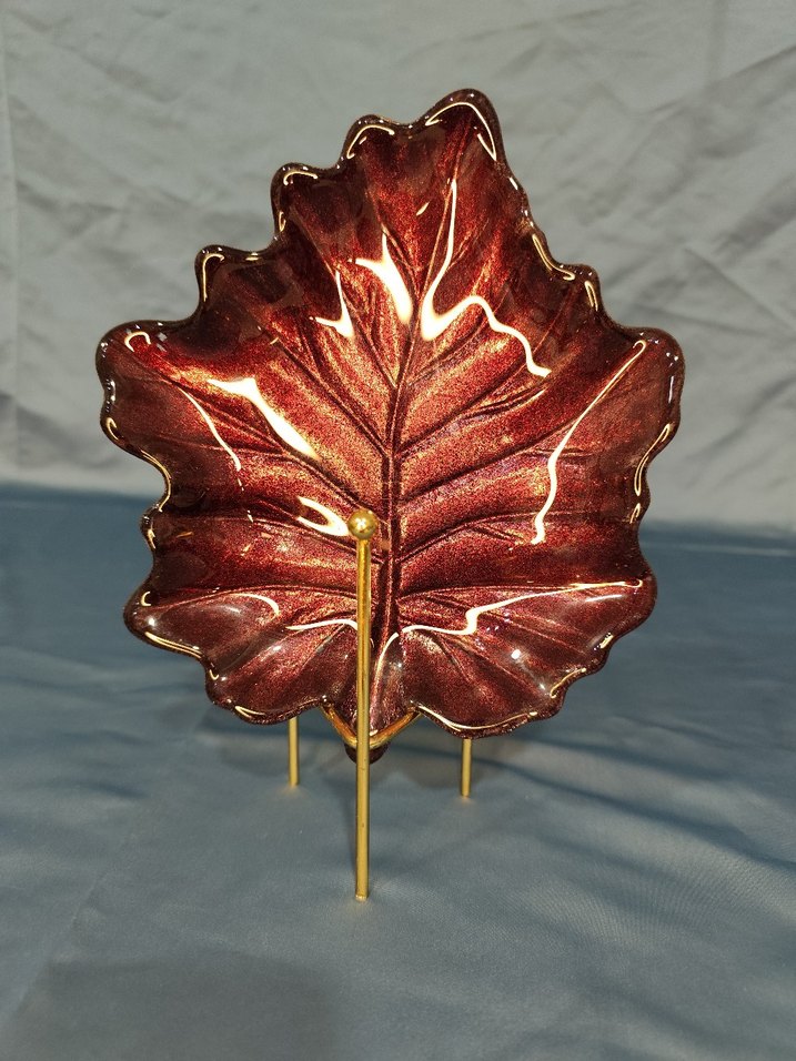 Simli bordo renkli, parlak yaprak şeklinde dekoratif tabak.