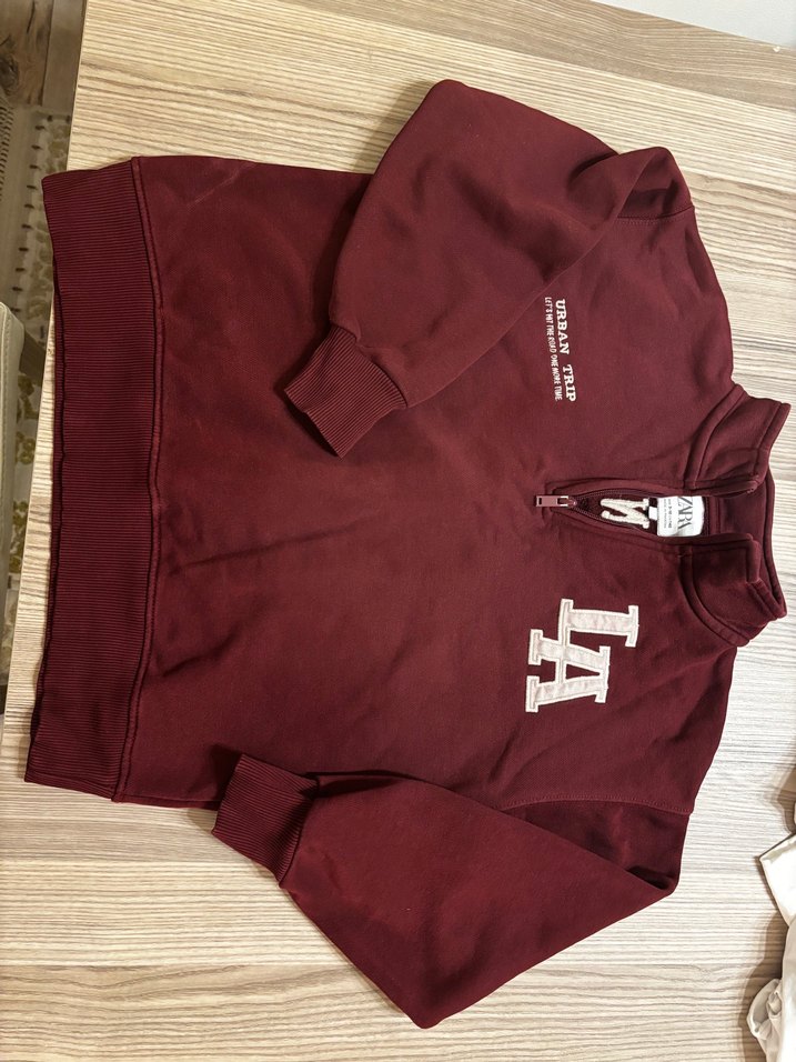 Bordo renkli, yüksek yakalı ve yarım fermuarlı erkek sweatshirtü. Yumuşak ve sıcak kumaştan, baskılı LA deseniyle rahat bir kesime sahiptir. Hafif renk solması var. Fotolarda görünüyor. 7-9 yaş için ideal