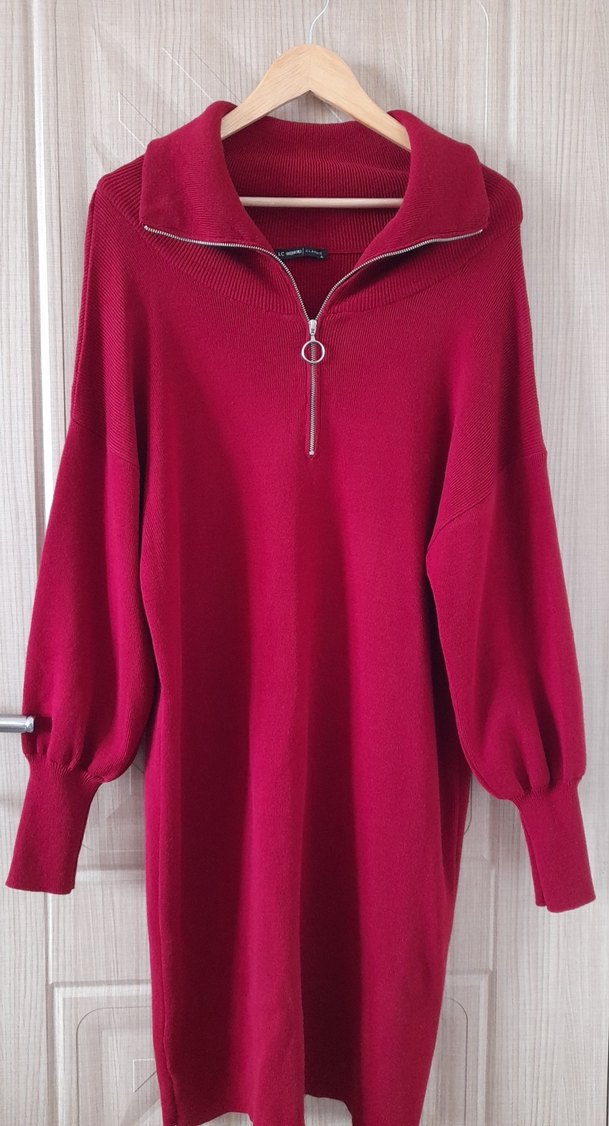 Bordo renkli, yarım fermuarlı, yüksek yakalı, uzun kollu ve bol kesim midi kazak. Yumuşak ve sıcak dokusuyla günlük sokak stiline uygundur.